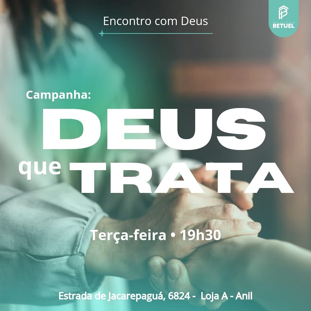 26 de março de 2024 : 19:30 - 22:00 Campanha – Deus que trata Igreja Cristã Betuel Estrada de Jacarepaguá, 7020 - Anil, Rio de Janeiro, Rio de Janeiro